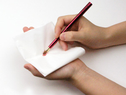 - 汚れが目立ってきたブラシは、平らなところに広げたティッシュやコットンの上で、やさしく毛先で線を描くように汚れを拭い取ってください。